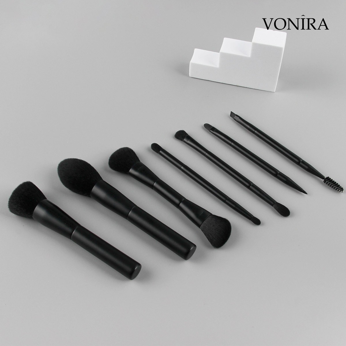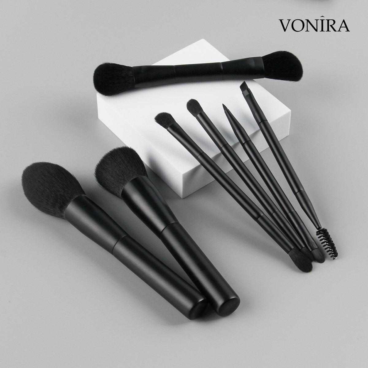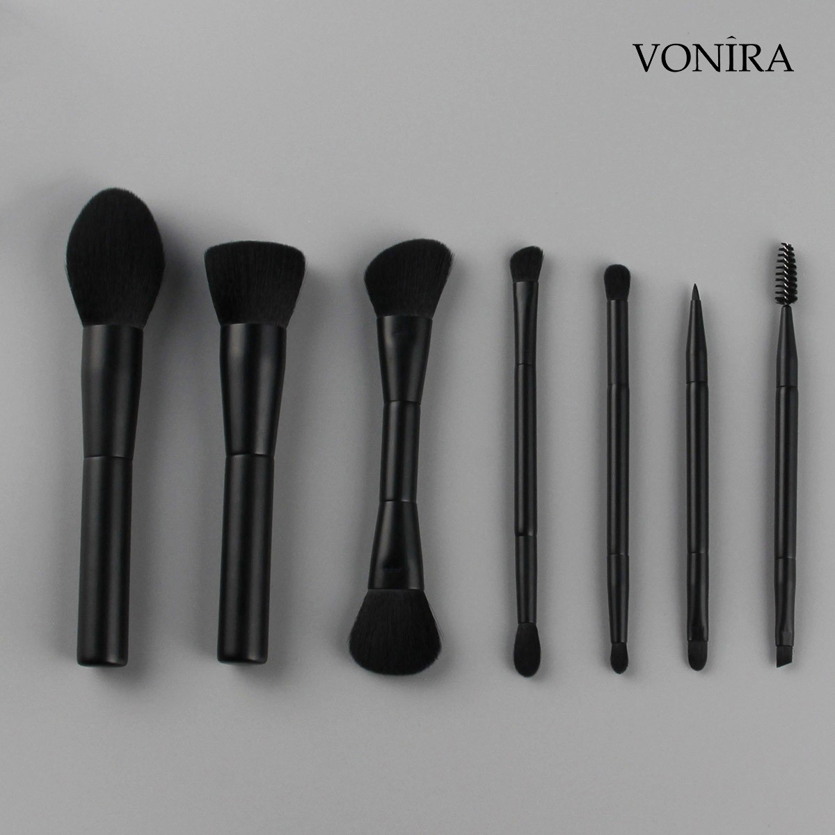 Vonira Beauty Factory Direct Wholesale 7 Piece Professional Gorgeous Dual Ended Cosmetic Brush Set With Matte Black Makeup Brushes Ferrule Handle Vegan Synthetic Hairs OEM ODM Custom Private Label Service