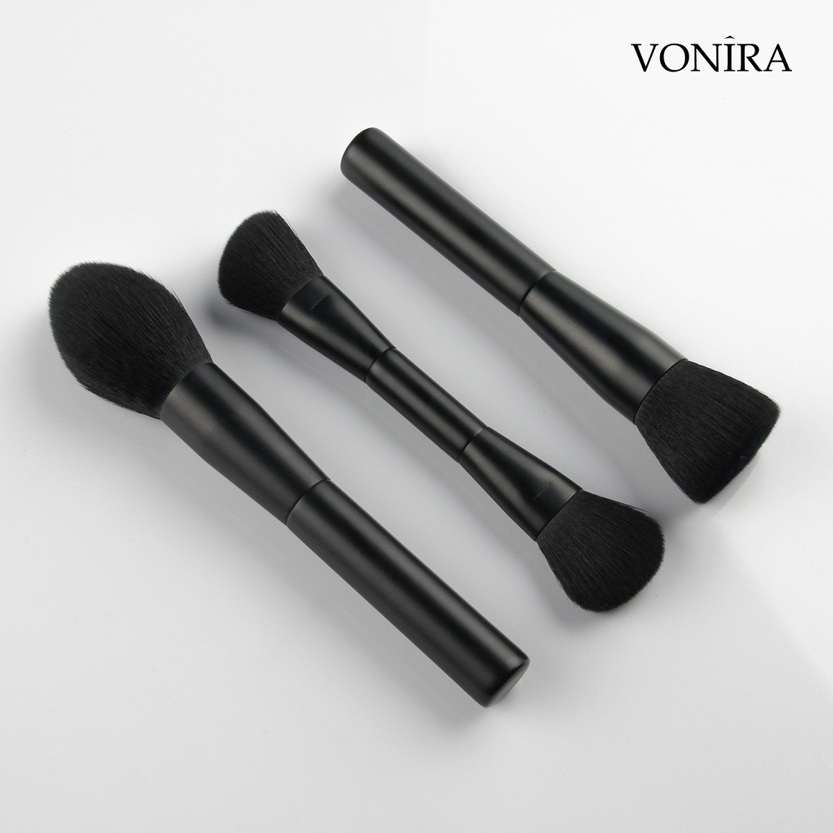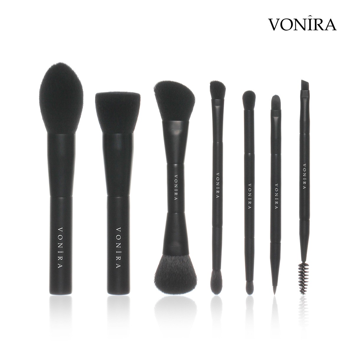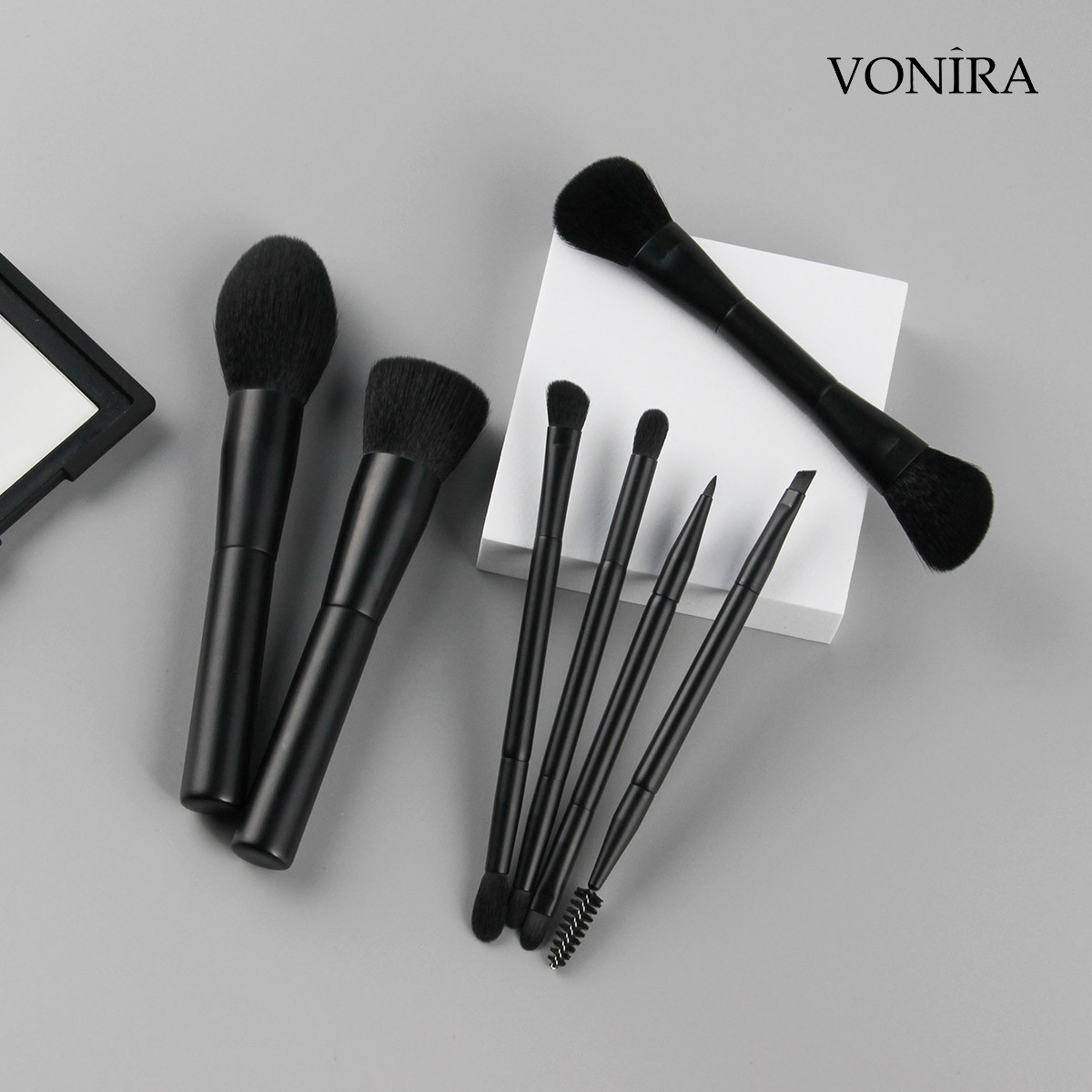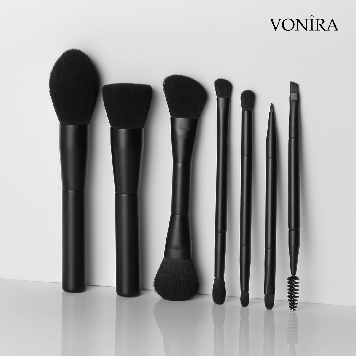 Vonira Beauty Factory Direct Wholesale 7 Piece Professional Gorgeous Dual Ended Cosmetic Brush Set With Matte Black Makeup Brushes Ferrule Handle Vegan Synthetic Hairs OEM ODM Custom Private Label Service