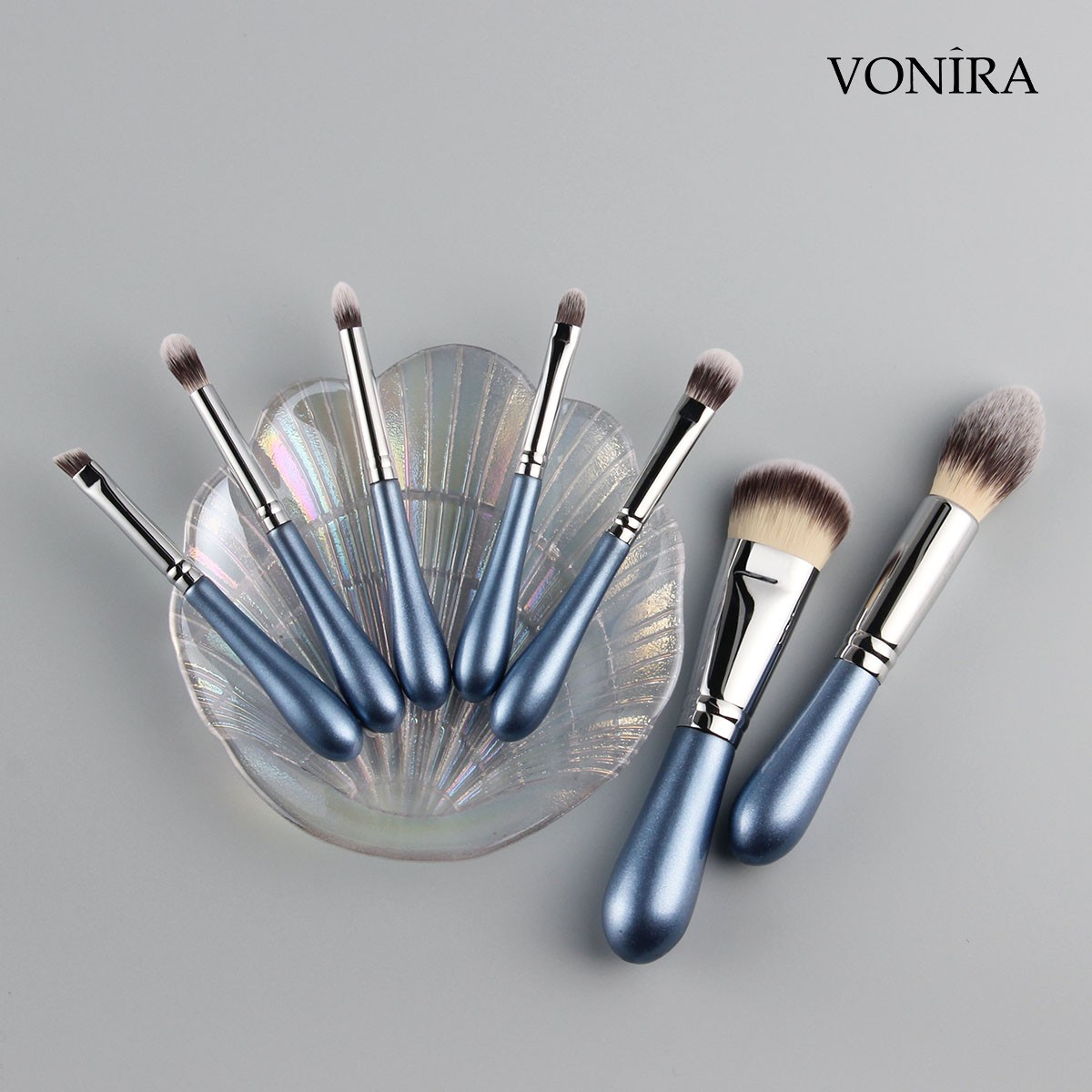 Vonira Brand New Style Blue Eggplant Travel Makeup Brush Kit Vegan Make up Cosmetic Brushes Set Private Label High Quality 7 Pieces