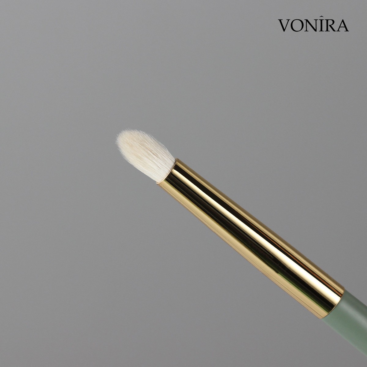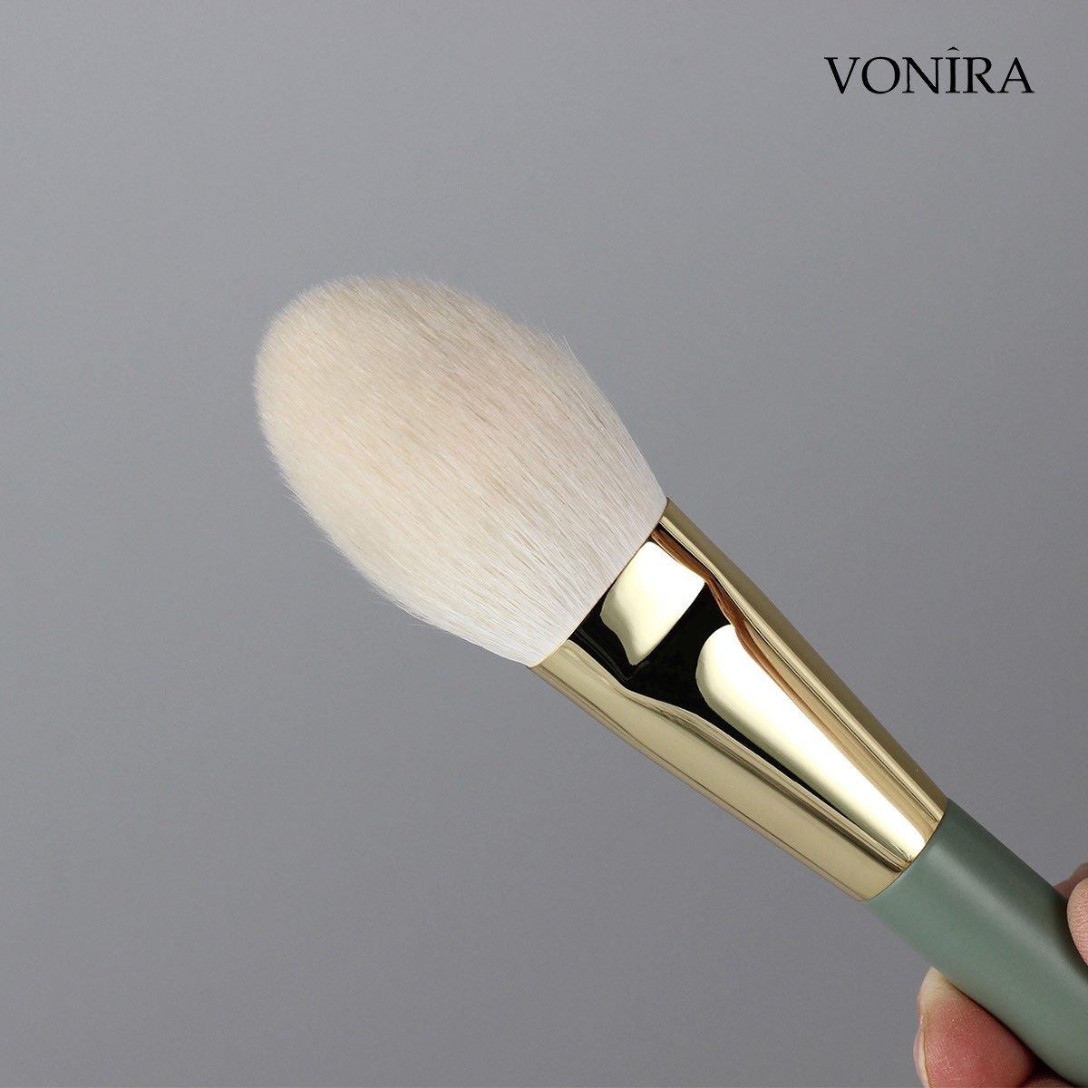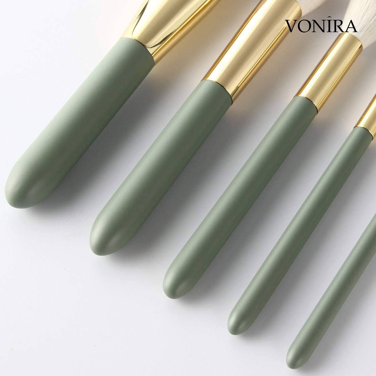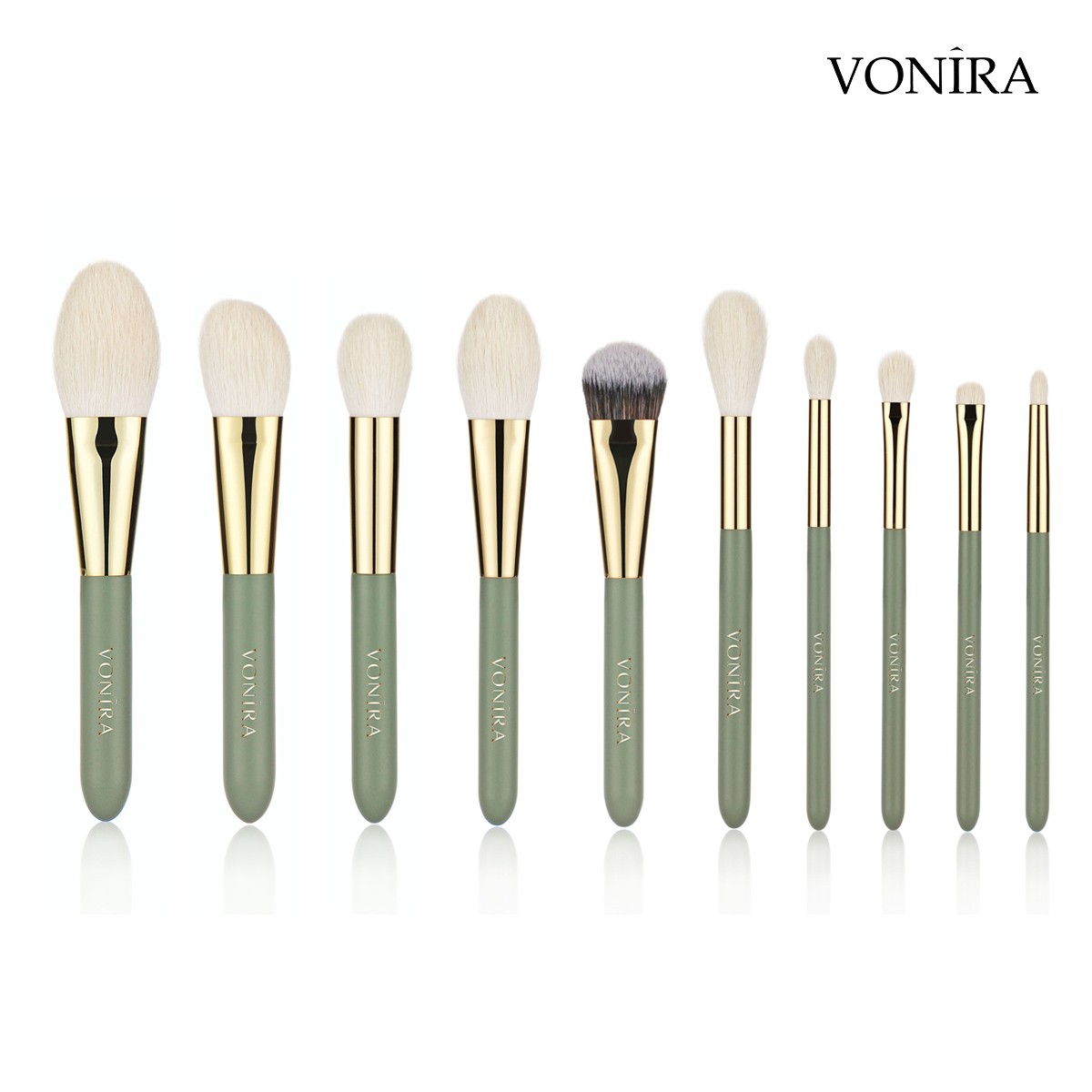 Vonira OEM Professional 10 Pieces Natural Animal Goat Hair Mocha Green Makeup Brush Set Free Sample Customised Cosmetic Brushes Making details